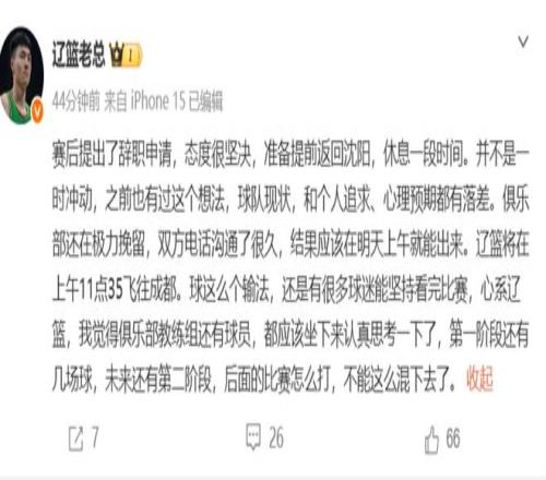 这个消息应该是比较真实的,“辽篮老总”随后继续补充:23年的时候,我爆料杨导没续约,没少挨骂。说实话,经历那次之后,我早就看淡这些了,什么热度还是流量,屁用没有,还惹一身骚。为啥这次还是和大伙说了一些球队的情况,就是因为辽篮都打成这样了,还能看球的真的都是铁杆球迷了,有些事得摆到桌面解决了,当断则断,球能输,不能这么稀里糊涂输了。