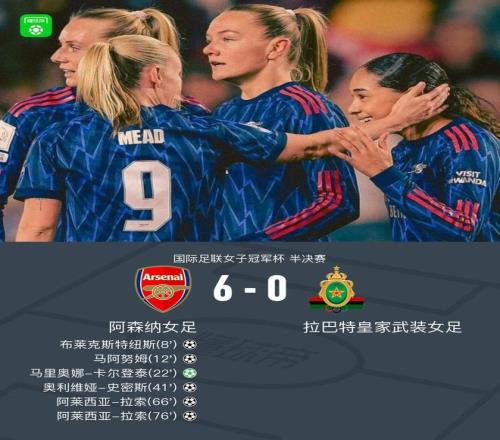 阿森纳女足多点开花60拉巴特皇家武装女足,晋级FIFA女冠杯决赛