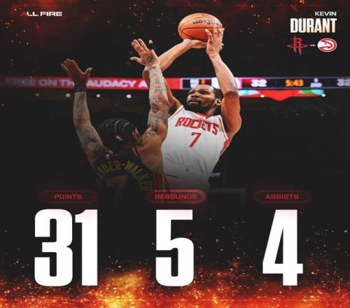 这场比赛伊森、芬尼-史密斯两个锋线因为背靠背要轮休,杜兰特需要承担更多的登场任务,上半场KD拿到12分不温不火,但第三节是他引来一波流,他单节打满12分钟,9中6,三分5中2,拿到16分3篮板1助攻,火箭一波35-24打崩老鹰。