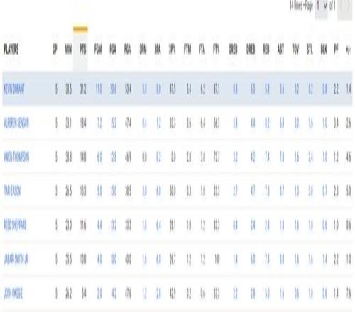 这场比赛杜兰特只打34分钟是过去五场比赛最少的一场,近五场比赛杜兰特4次30+,场均38.5分钟,拿到31.2分5.8篮板3.6助攻0.2抢断0.8盖帽,命中率53.4%,三分命中率47.5%,罚球命中率87.1%,正负值+1.4。