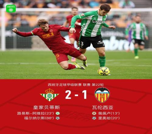 北京时间2月1日西班牙足球甲级联赛 联赛 第22轮,皇家贝蒂斯主场对阵瓦伦西亚。皇家贝蒂斯路易斯-阿维拉破门,福尔纳尔斯破门。瓦伦西亚里奥哈破门。最终比分皇家贝蒂斯 2-1 瓦伦西亚。